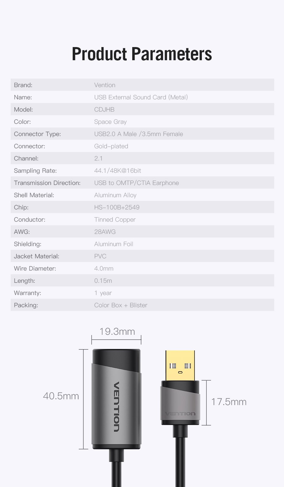 Tipo | USB2.0 A Macho, 3.5mm Fêmea |