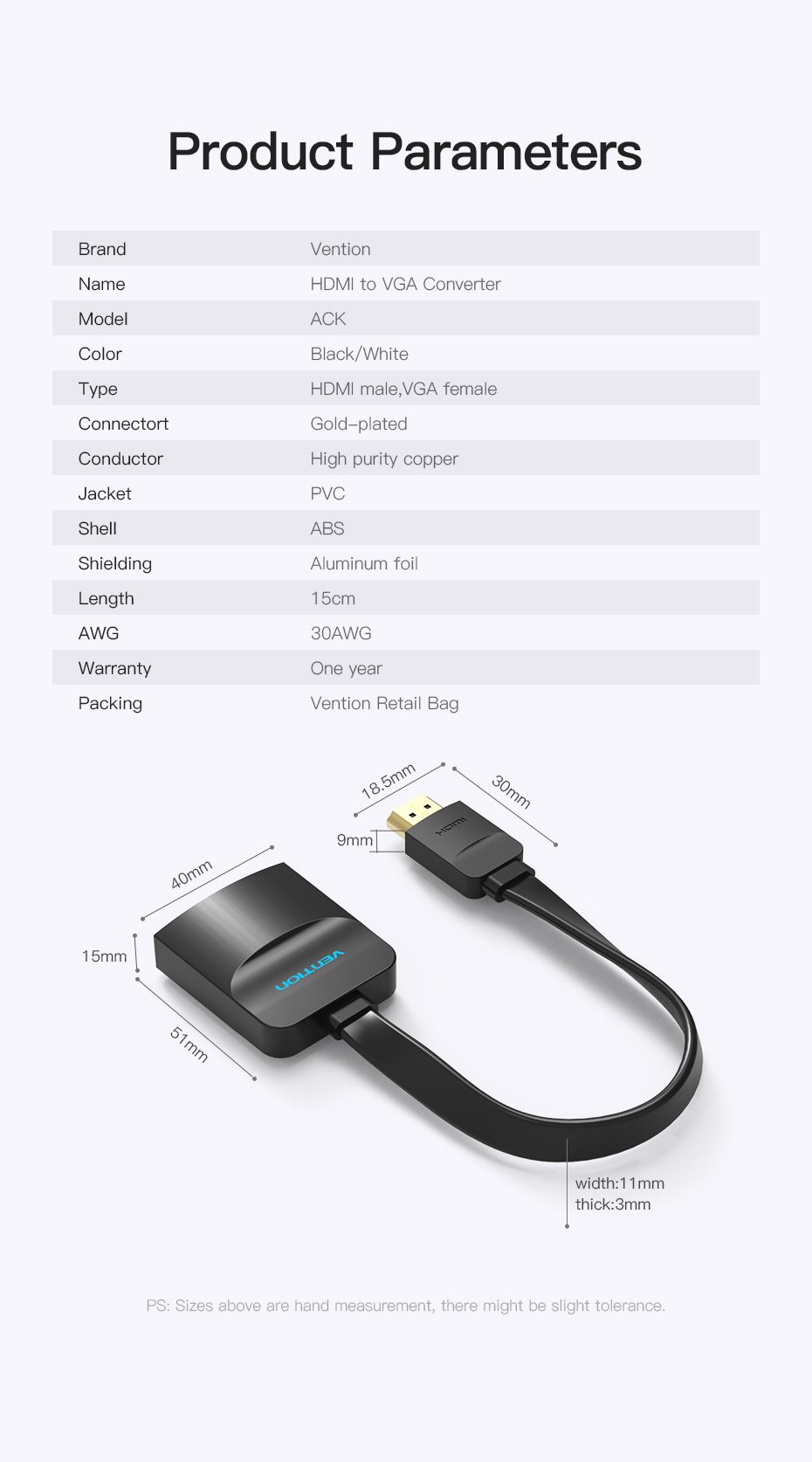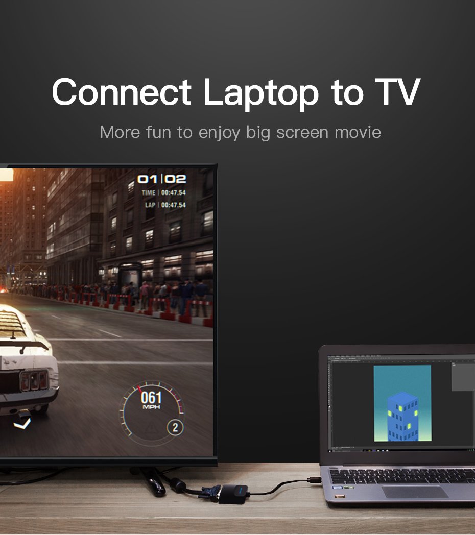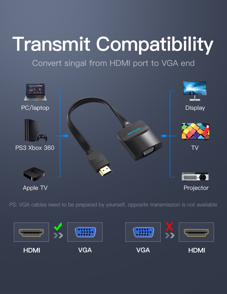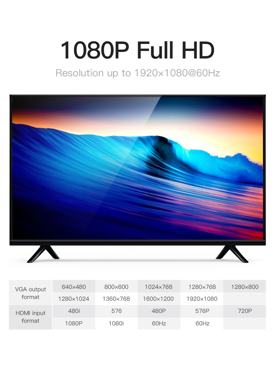 | Portas | 1* HDMI A Macho, 1* VGA Fêmea, 1* 3.5mm Fêmea, 1* USB2.0 Micro-B Fêmea |